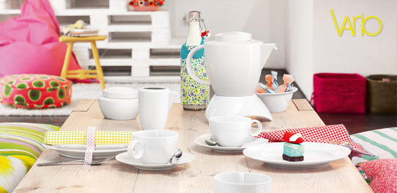 Diese Strenge und die graphische Anmutung vertragen sich wunderbar mit auflockernden Akzenten, die zum Beispiel über farbenfrohe Servietten gesetzt werden können. So kann »Vario« genauso zum eleganten Candle Light Dinner wie für eine bunte Kaffeetafel auf den Tisch gebracht werden.